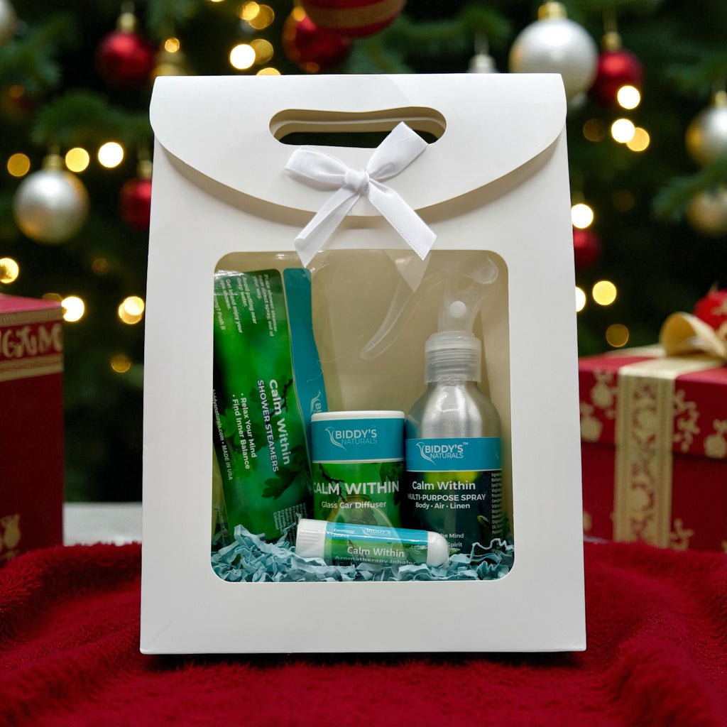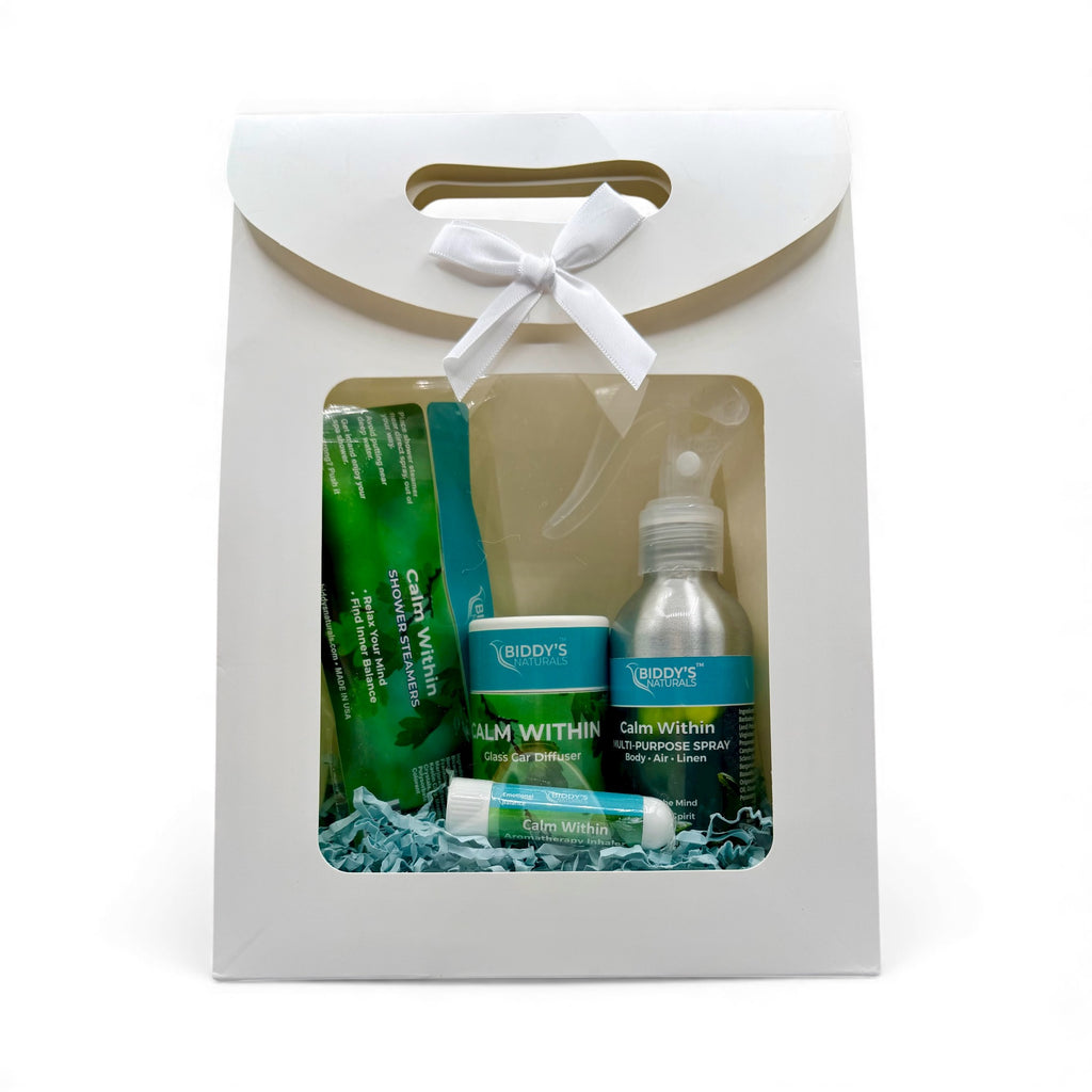 Soothe the senses with Calm Within — a blend of Ho Wood, Clary Sage, Bergamot, and Frankincense. Includes Body • Air • Linen Spray, Car Diffuser, 6 Shower Steamers, Inhaler, and Mindfulness Mist.