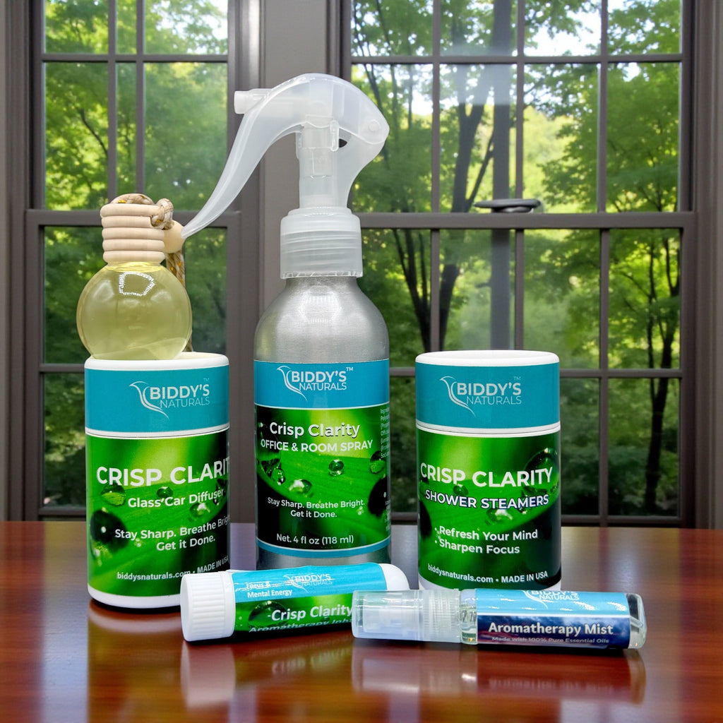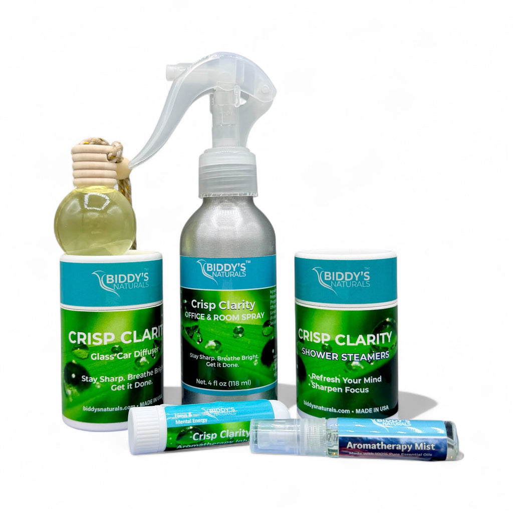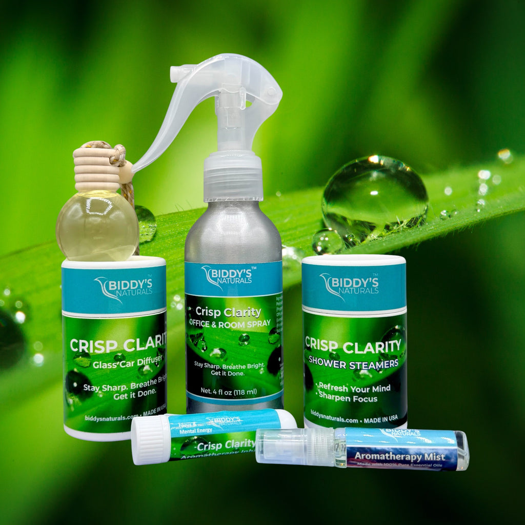 Bright and refreshing. Includes Crisp Clarity Office • Room Spray, Inhaler, 6 Shower Steamers, Car Diffuser, and Mindfulness Mist for clear energy and renewed concentration.