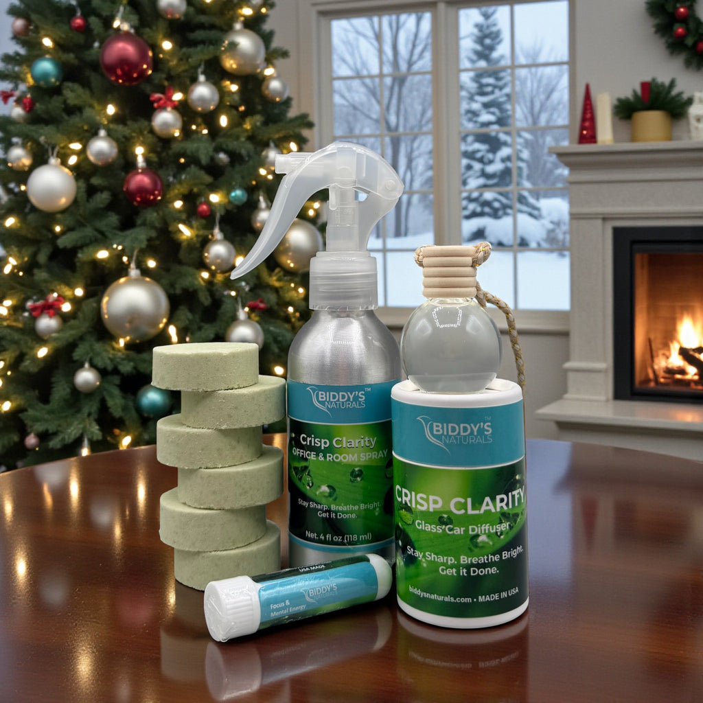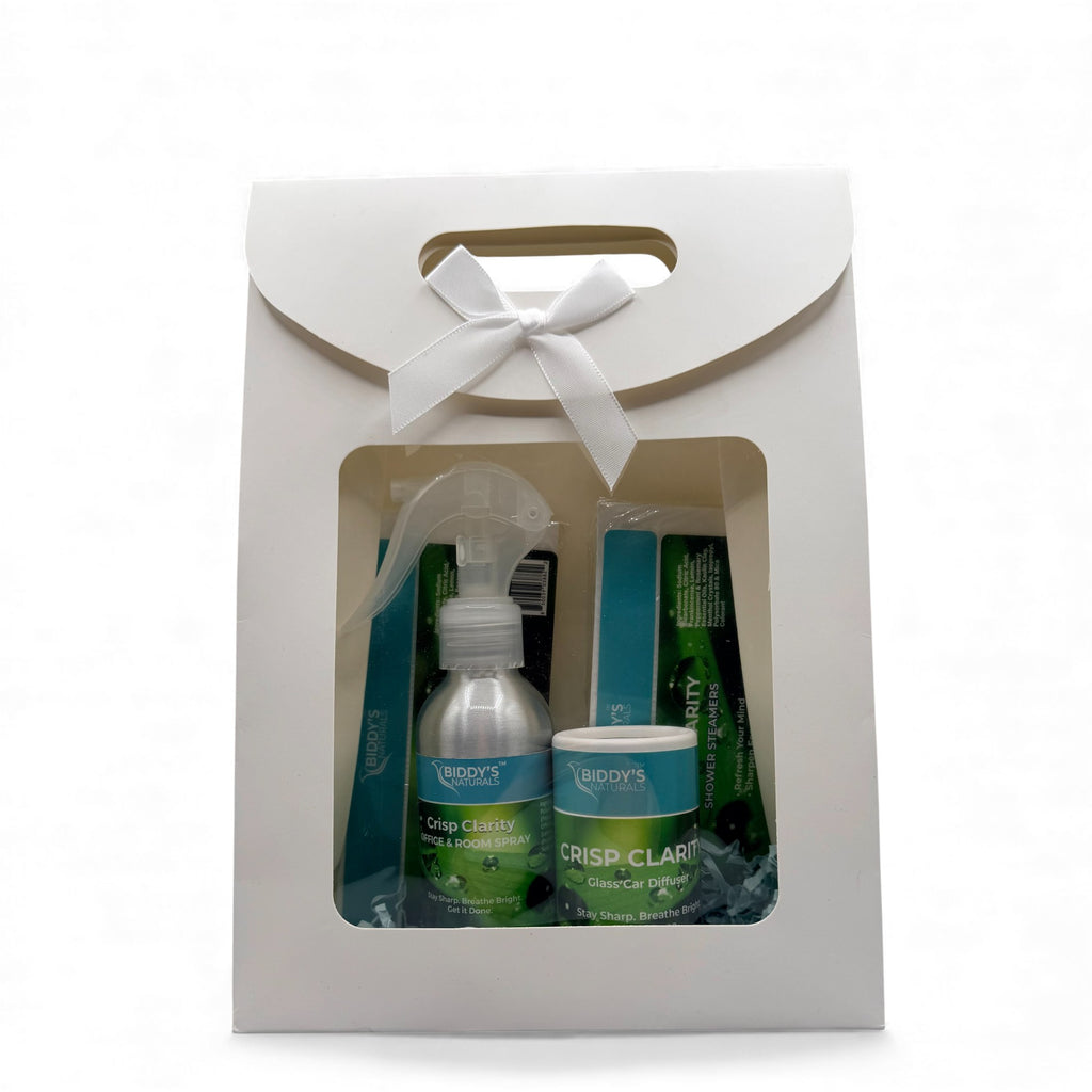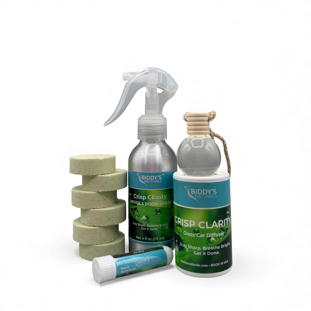 Bright and refreshing. Includes Crisp Clarity Office • Room Spray, Inhaler, 6 Shower Steamers, and a Car Diffuser for clear energy and renewed concentration.