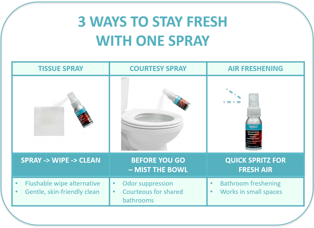 Courtesy: Spray into the toilet bowl 3-5x before use. The essential oils form a barrier to help trap odor underwater.