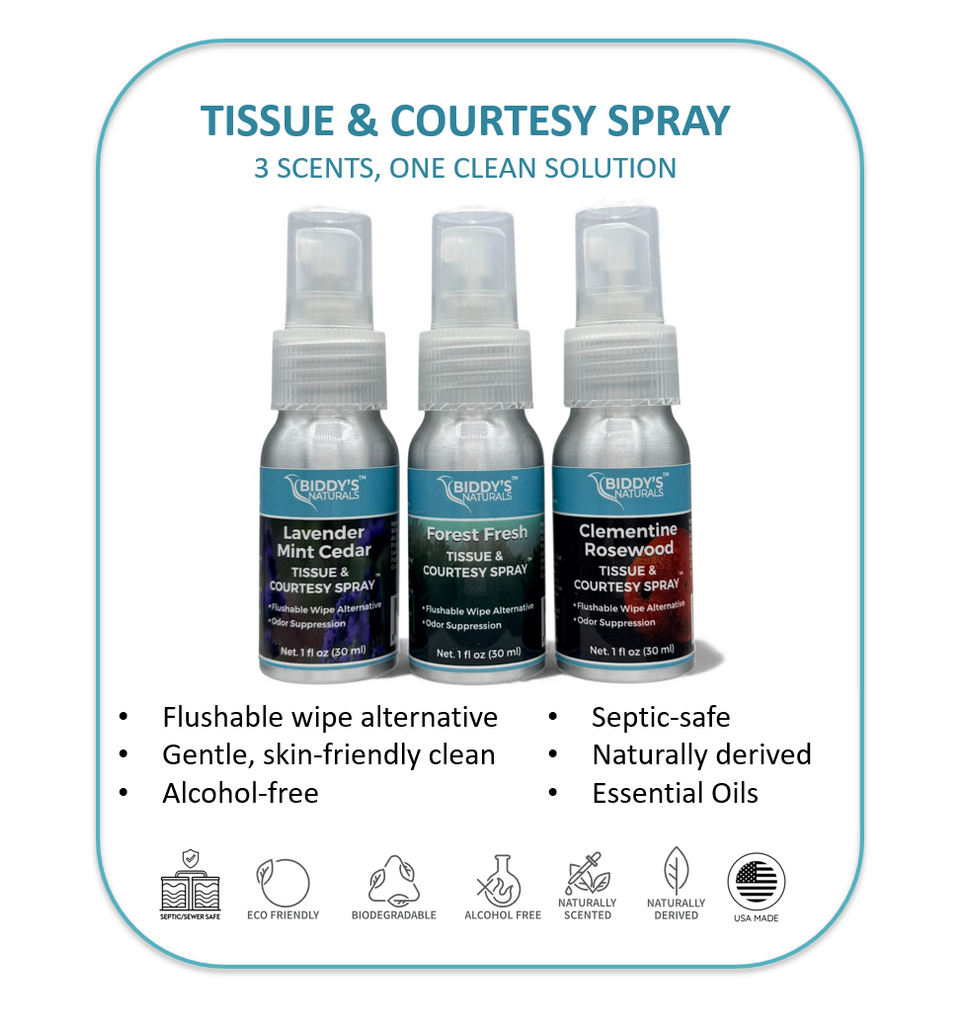 Bright, soft, and effortlessly elegant, Clementine Rosewood is your bathroom’s best-kept secret. Use it as a pre-spray on toilet water to trap odors naturally — or spritz onto toilet paper to create a gentle, flush-free adult wipe that soothes while it cleanses. With mood-boosting clementine, ho wood, palmarosa, and grounding frankincense, this spray leaves behind a delicate citrus-floral scent and peace of mind. No more harsh chemicals or plumbing issues — just comfort, confidence, and class.